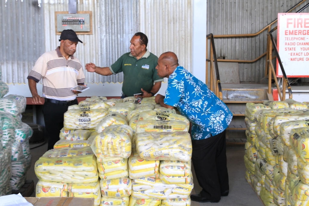 Supplies for villages across the ok tedi. Director John Atmeyok receivees bales of rice from MRDC Kini Renagi